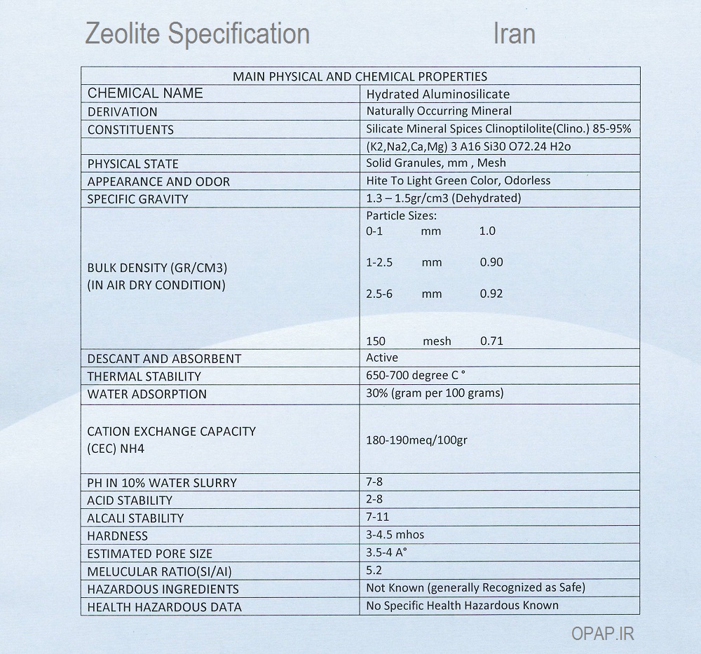 Ntaural Zeolite, clino content 98%,1.3-1.5 gr/cm3,Termal stability 650-700 degree selesious,water absorption 30%,NH4 cation exchanges capacity 180-190 meq/11gr,PH 7-8,