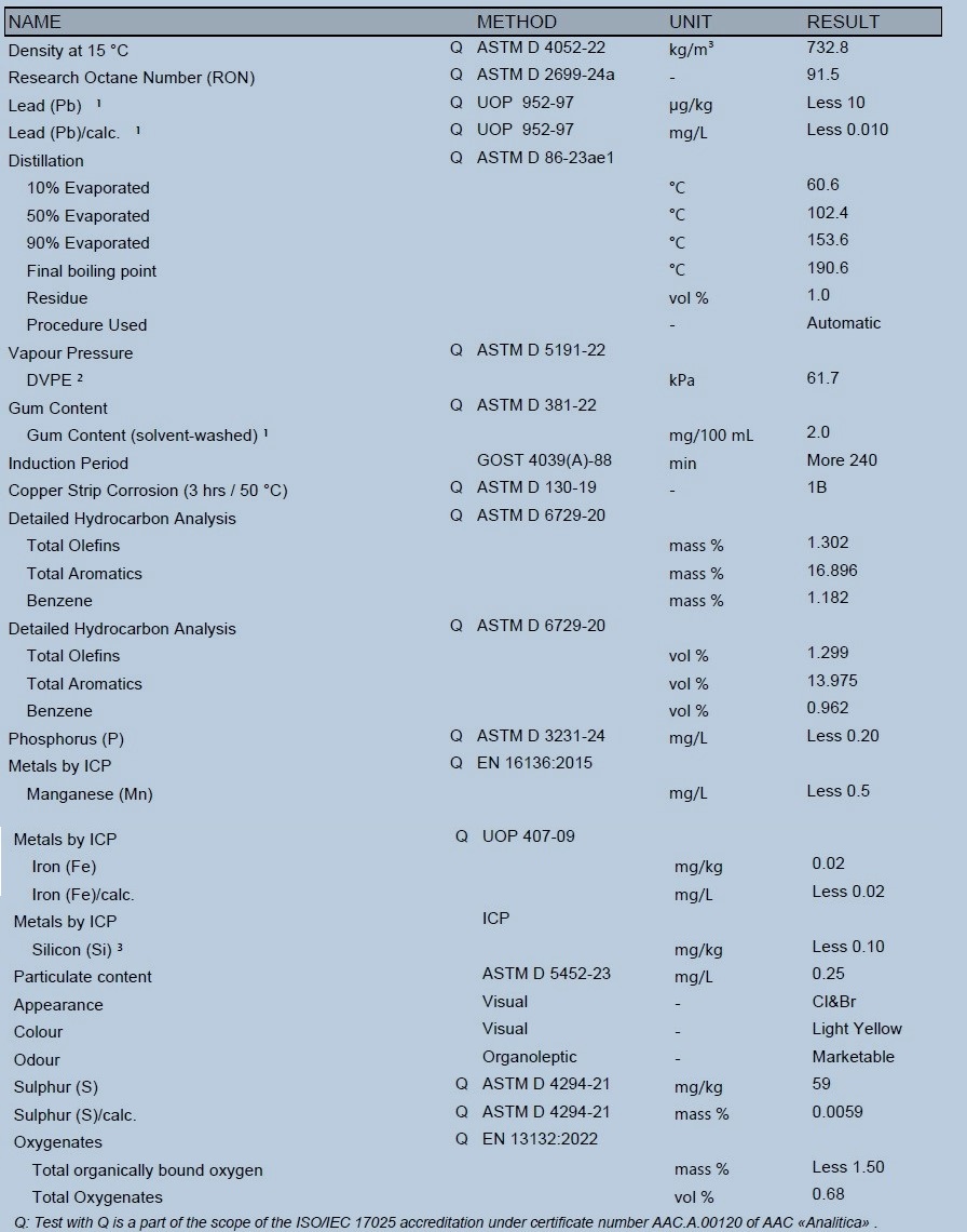 Density 833 , Sulphur 59 , RON 91.5, R.V.P 61.7 , 10% Eva 60.6 , FBP 190.6 , Benzene 0.96 , Aromatics 13.9 , Copper Corrosion 1B , lead 0.010 mg/L