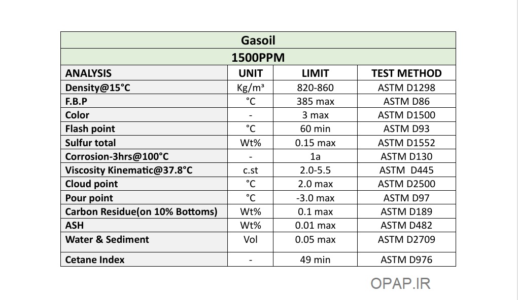 مشخصات گازوئیل 1500 پی پی ام